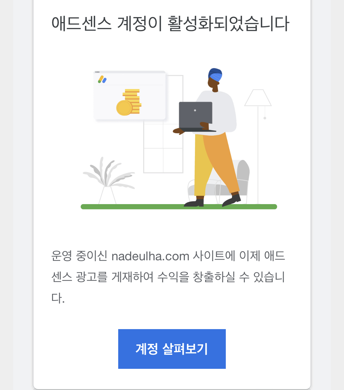 뭐가 뭔지 잘 모르는 상태에서 일단 저질러본 애드센스 승인 신청에서 첫 번째때는 거절당하고 (2주 만에 답변), 두 번째는 다른 수정 없이 글자 수를 좀 더 늘리며 포스팅을 5개 정도 더 했는데 신청한지 3일 만에 승인이 났어요. 애드고시라는 말도 들어봤었는데 이만하게 통과할 수 있어서 감사한 마음입니다.